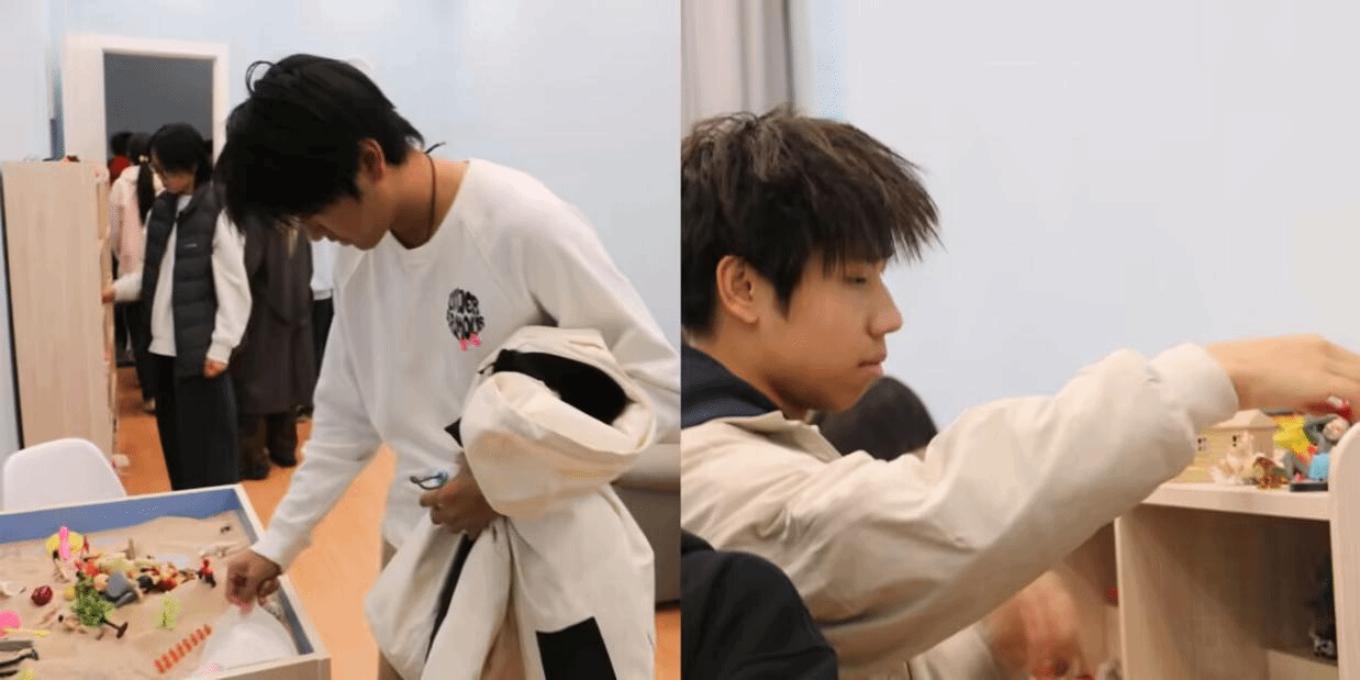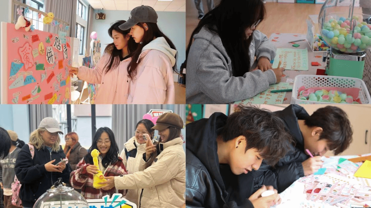 在沙盘室里,同学们借助沙具与沙盘开展自我表达,在无声的创作过程中自然释放负面情绪、深度探索内心世界。随后,大家移步团体辅导室,参与多项特色心理互动活动:“毛线墙”活动中,学生通过缠绕毛线的方式,直观认识自身性格特质;“拼贴诗创作”环节,大家在形状各异的纸片上,书写内心独白与暖心激励话语,传递正向力量;“微笑博物馆”集中展示同学们的丰富表情,鼓励大家勇敢呈现并接纳真实情绪。此外,“情绪调色盘”为学生提供颜料与画笔,助力大家描绘专属内心图景;“烦恼扭蛋机”则邀请参与者写下烦恼投入其中,随机收获定制化鼓励与可落地的行动建议。现场氛围热烈且治愈。