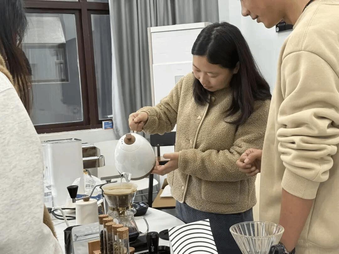 手冲体验环节里,辅导员们亲手冲煮咖啡,慢节奏的手作环节让辅导员们在忙碌的工作之余,体验到了放松,肩上的压力随着蒸腾的热气和空气中飘香的咖啡香一同消失。